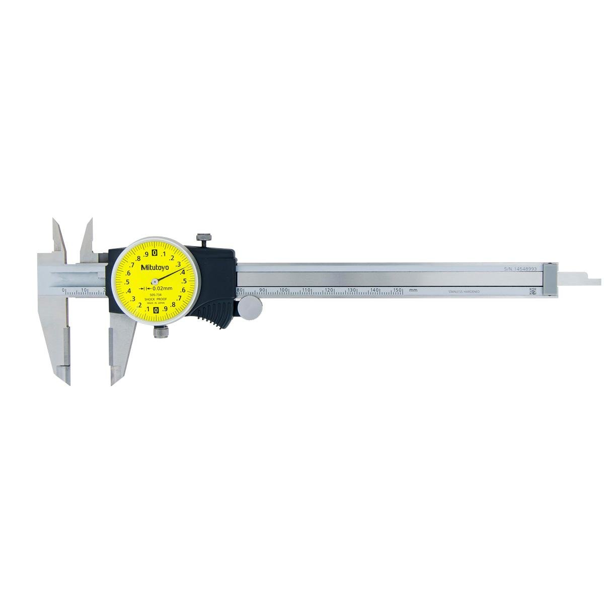 Mitutoyo 505-734 Dial Caliper has a measuring range of 0-150mm with 2mm Per One Revolution and Carbide-tipped jaws for OD measurement This model features improved finish on sliding surfaces for longevity and easier-to-read font High shock protection Equipped with a lock screw for dial bezel and holding the sliding jaw position